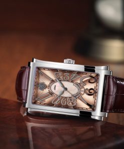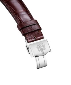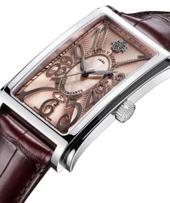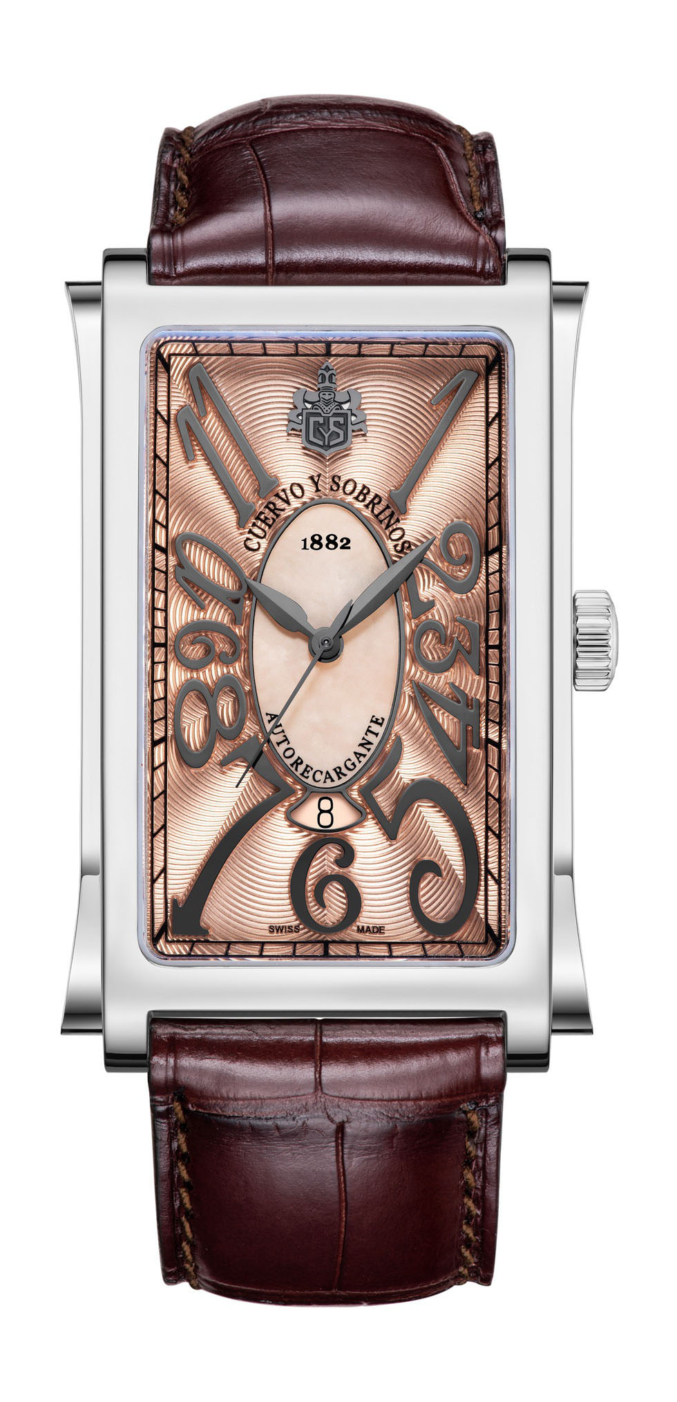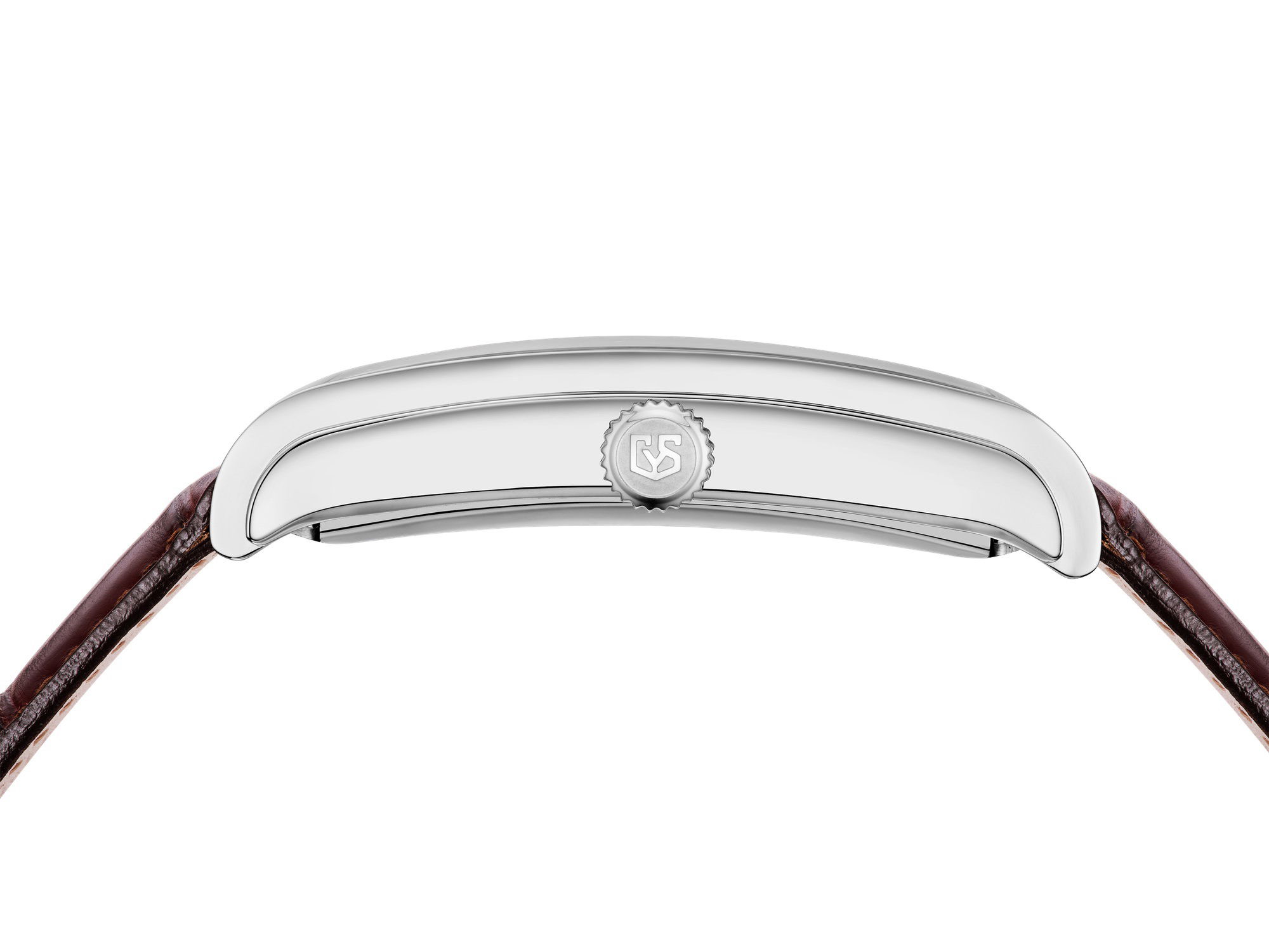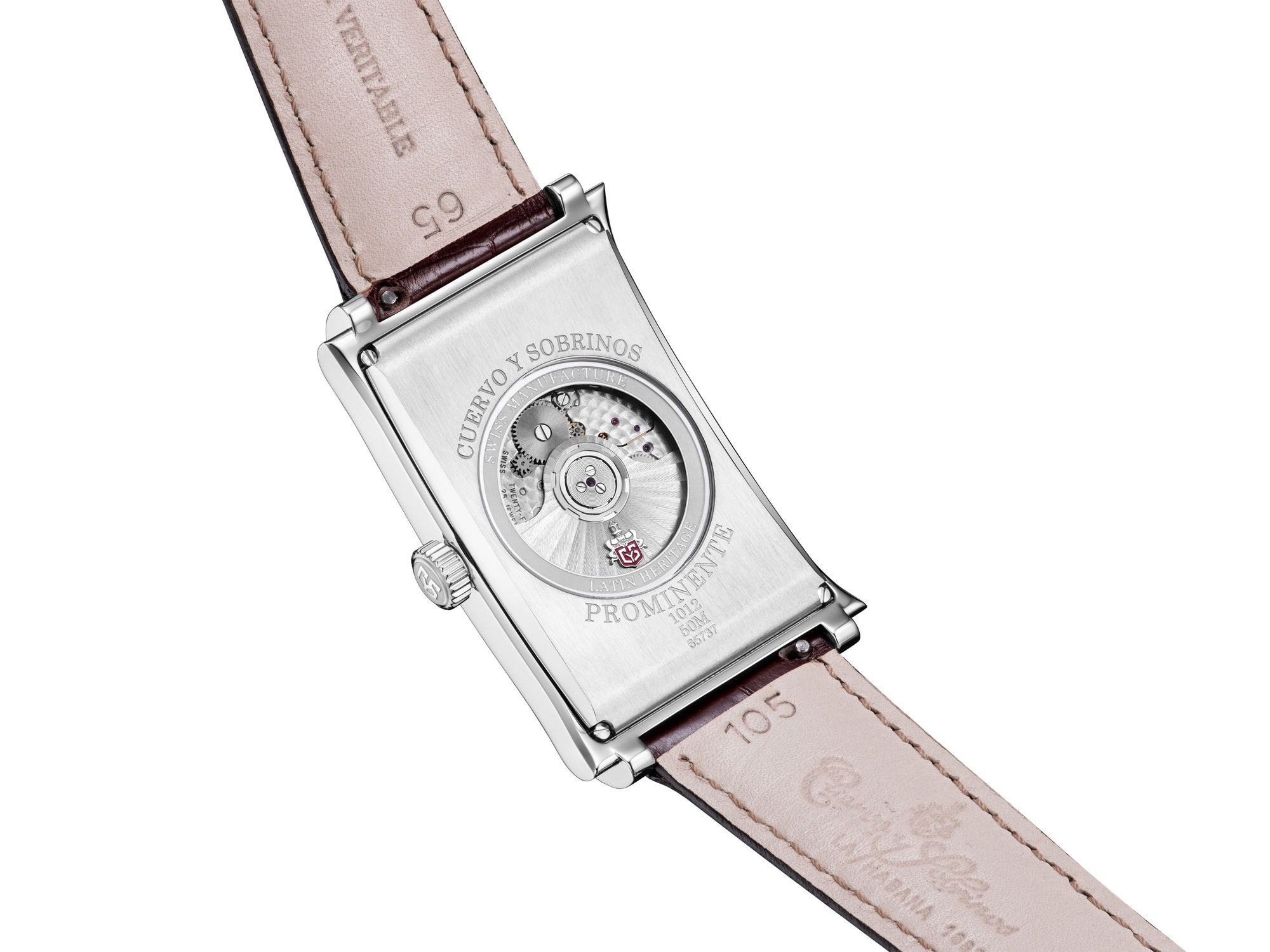 The Prominente Prominente Icónico comes in an imposing stainless steel case featuring rhodium-plated hour and minute hands, clearly indicating the time. Alongside these, there’s a central sweep seconds hand and a date display, offering only the essential functions for timekeeping. The design of the Prominente Icónico prioritizes clarity and elegance, with its elongated case blending intricate curves with sharp lines. The stepped sides of the case are noticeable from the front, while the smooth curves become apparent when viewed from the side, giving it a gentle profile. The dial features elaborate Arabic numerals of varying sizes, adding a touch of vintage charm. A chemin de fer encircles the dial, enhancing readability and providing a stylish separation from the case.