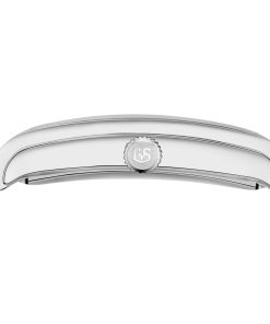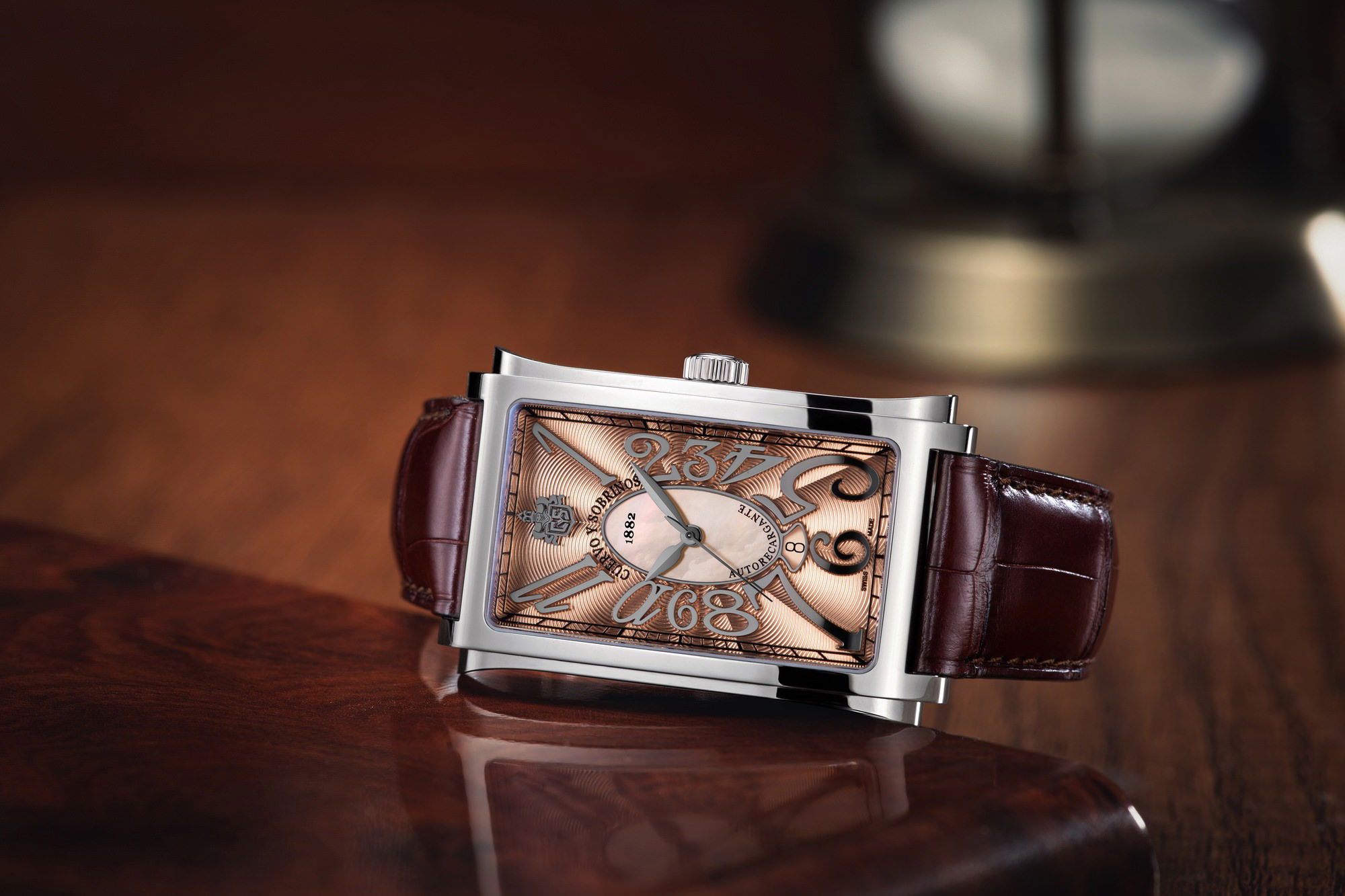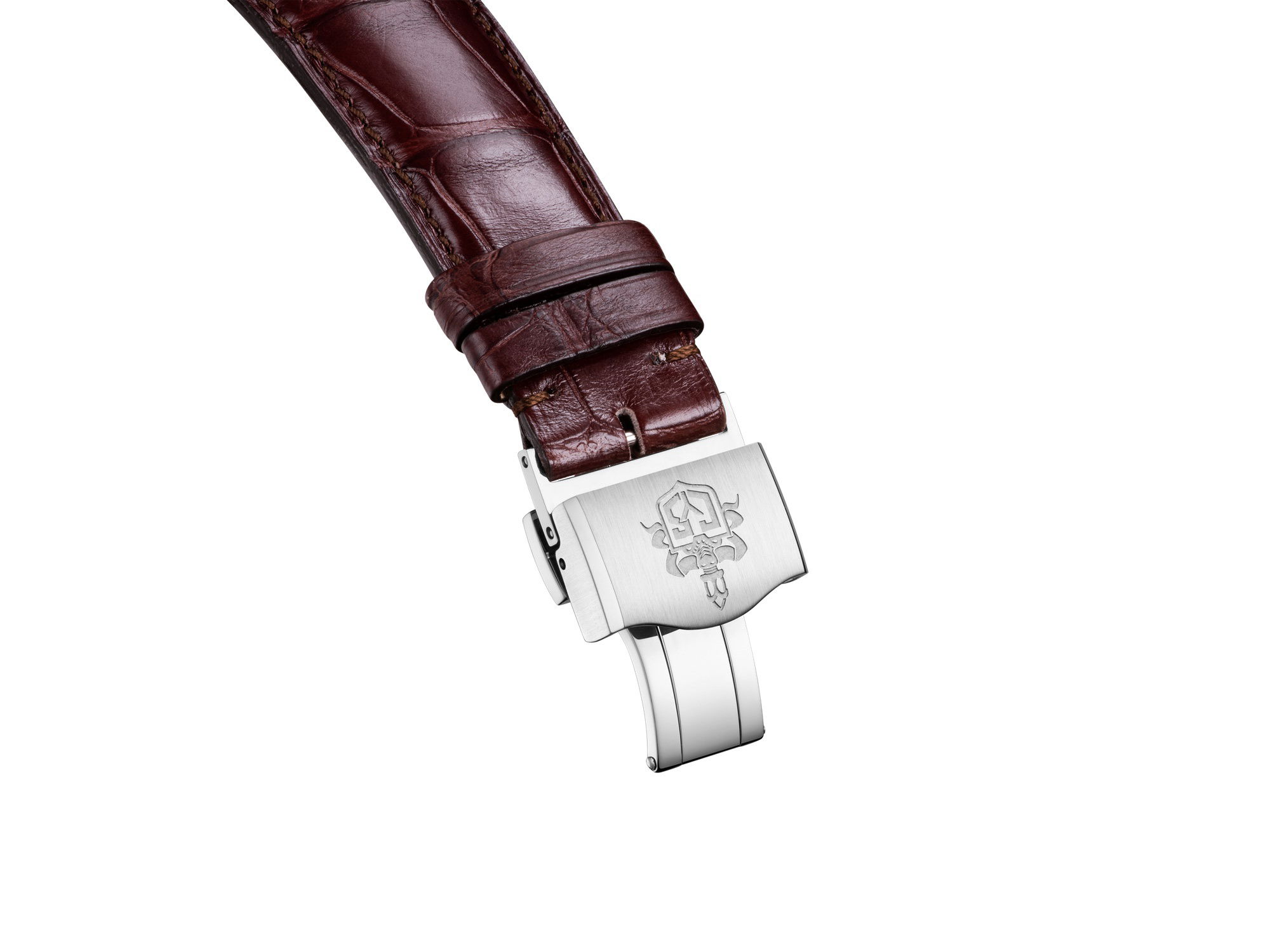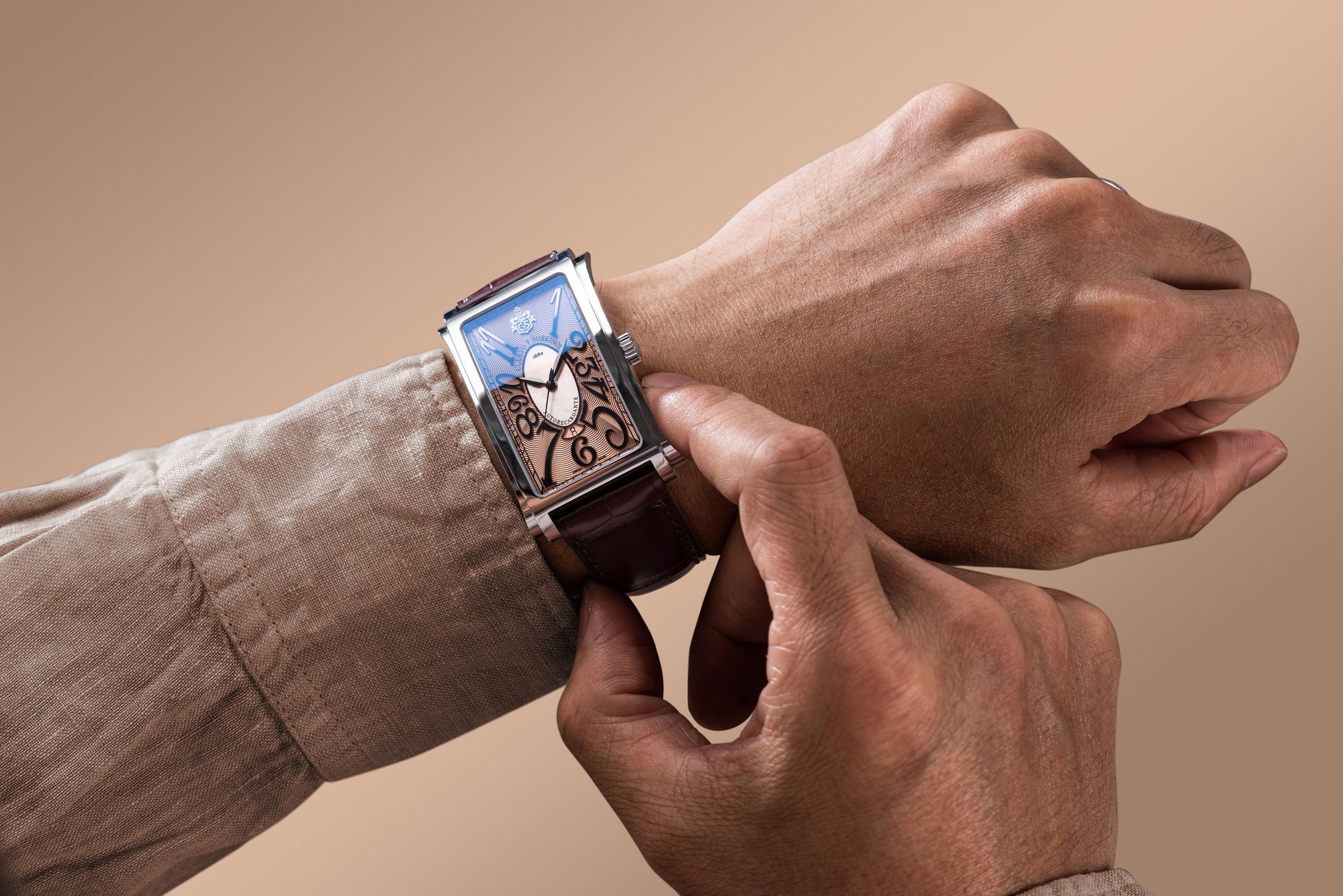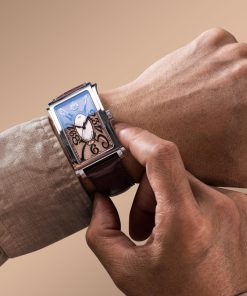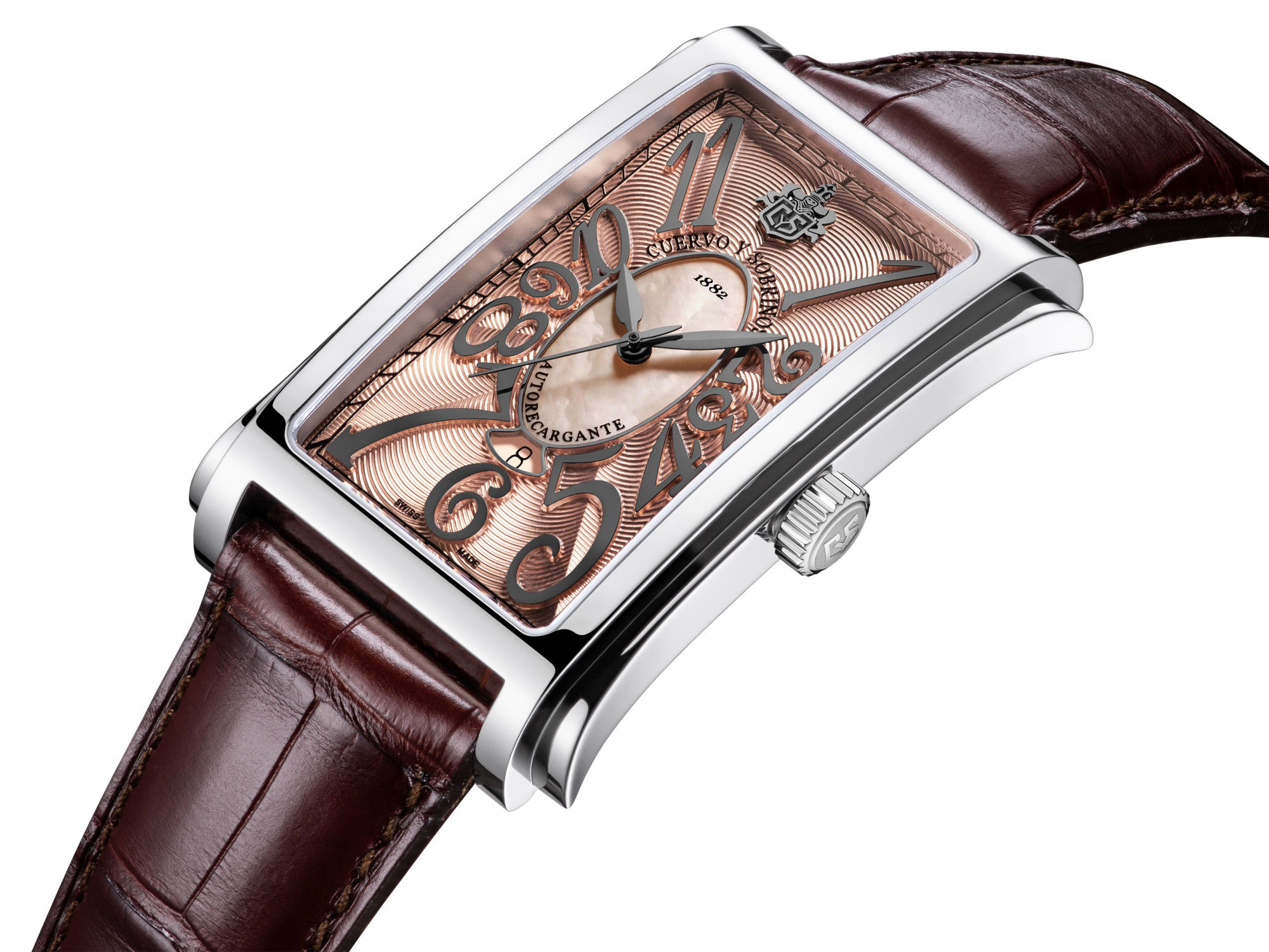 The Prominente Prominente Icónico comes in an imposing stainless steel case featuring rhodium-plated hour and minute hands, clearly indicating the time. Alongside these, there’s a central sweep seconds hand and a date display, offering only the essential functions for timekeeping. The design of the Prominente Icónico prioritizes clarity and elegance, with its elongated case blending intricate curves with sharp lines. The stepped sides of the case are noticeable from the front, while the smooth curves become apparent when viewed from the side, giving it a gentle profile. The dial features elaborate Arabic numerals of varying sizes, adding a touch of vintage charm. A chemin de fer encircles the dial, enhancing readability and providing a stylish separation from the case.