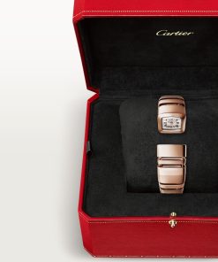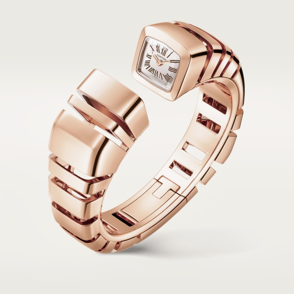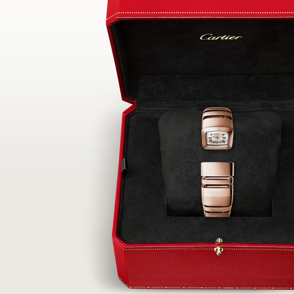 Reflection de Cartier watch, quartz movement. 18K rose gold (750/1000) case. Sandblasted dial, rose gold-finish steel sword-shaped hands, sapphire crystal. 18K rose gold (750/1000) bracelet. Case dimensions: 18.4 mm x 17.5 mm, thickness 8.9 mm. Water-resistant up to 3 bar (approx. 30 meters/100 feet).