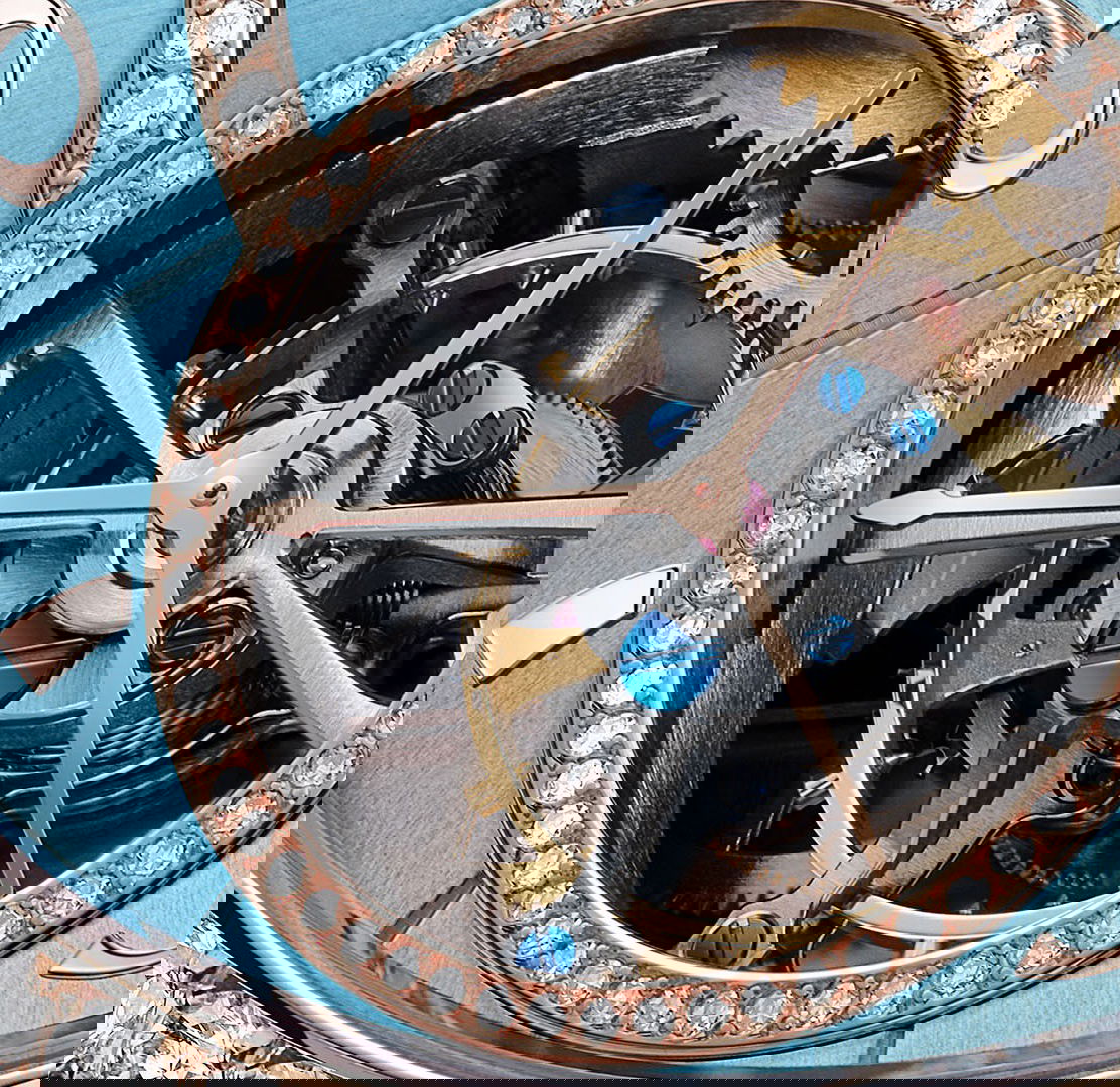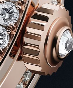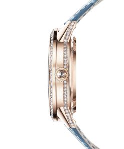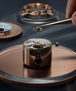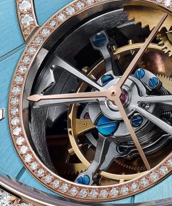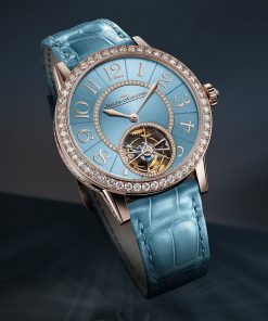 A matching blue alligator strap with an interchangeable option adds versatility, while diamonds are set on the bezel, case sides, and crown. At its heart, a tourbillon escapement, visible at 6 o’clock, offsets gravitational effects and offers a mesmerizing display of precision.