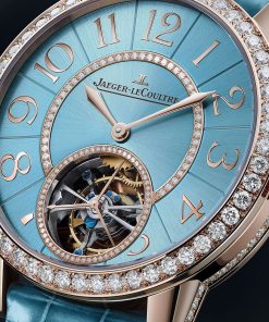 Jaeger-LeCoultre’s latest Rendez-Vous Jewellery Tourbillon is a blend of artistic elegance and technical mastery. The 39mm pink gold case (18K) features a sunray-finished dial in a unique blue-green shade, accented by brilliant-cut diamonds and a captivating tourbillon display.