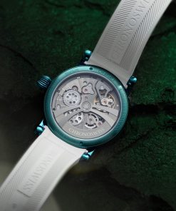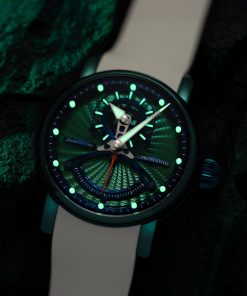 At the heart of the Snake is a green CVD-coated dial, hand-guillochéd in Lucerne and alive with texture. The signature ReSec regulator layout adds architectural depth, with hour and minute rings circling a retrograde seconds display that snaps back like a serpent’s tongue. Visible beneath the surface, the exposed gear train reveals the movement’s complexity, finished in contrasting tones for added drama.