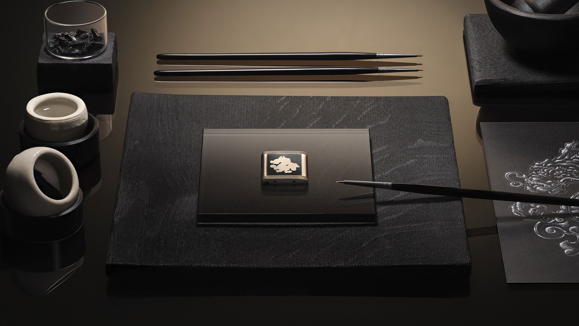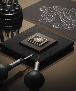 On the reverse side, a majestic dragon, engraved into pink gold and set against a glossy black Grand Feu enamel background, appears to leap out. This effect is enhanced by the detailed engraving, including the dragon’s polished and sandblasted textures. The technique of modelled engraving, requiring 80 hours of work, was employed here with exceptional precision, especially since the engraving began on an already enameled surface.