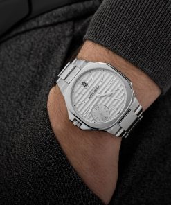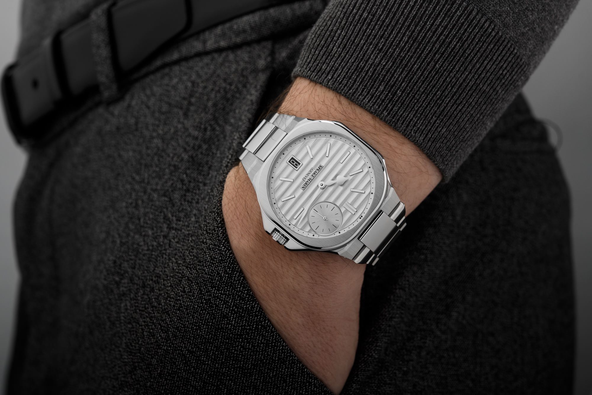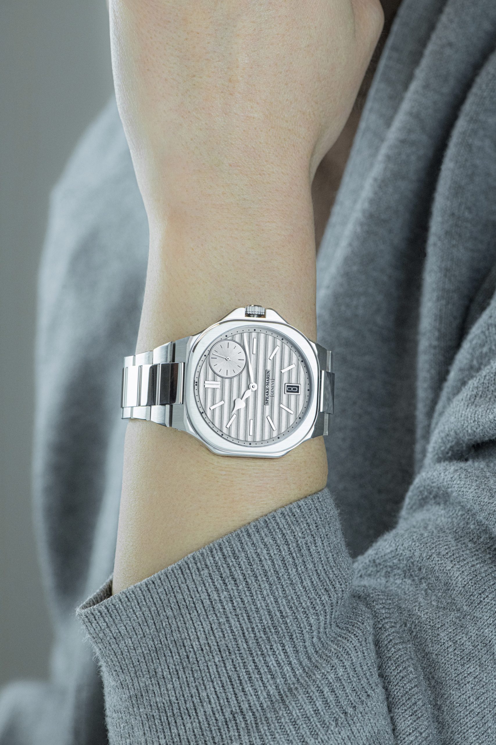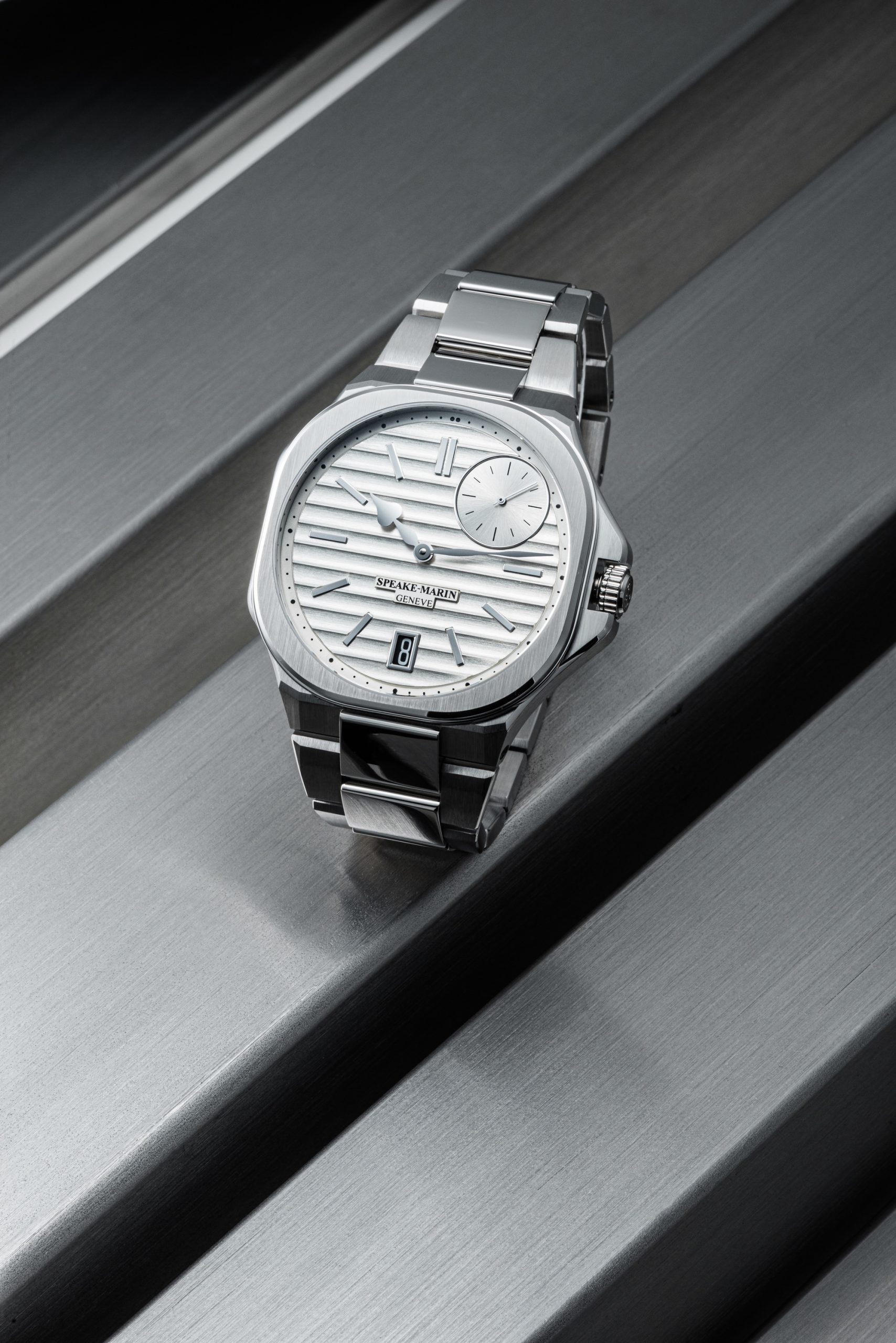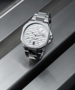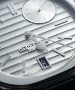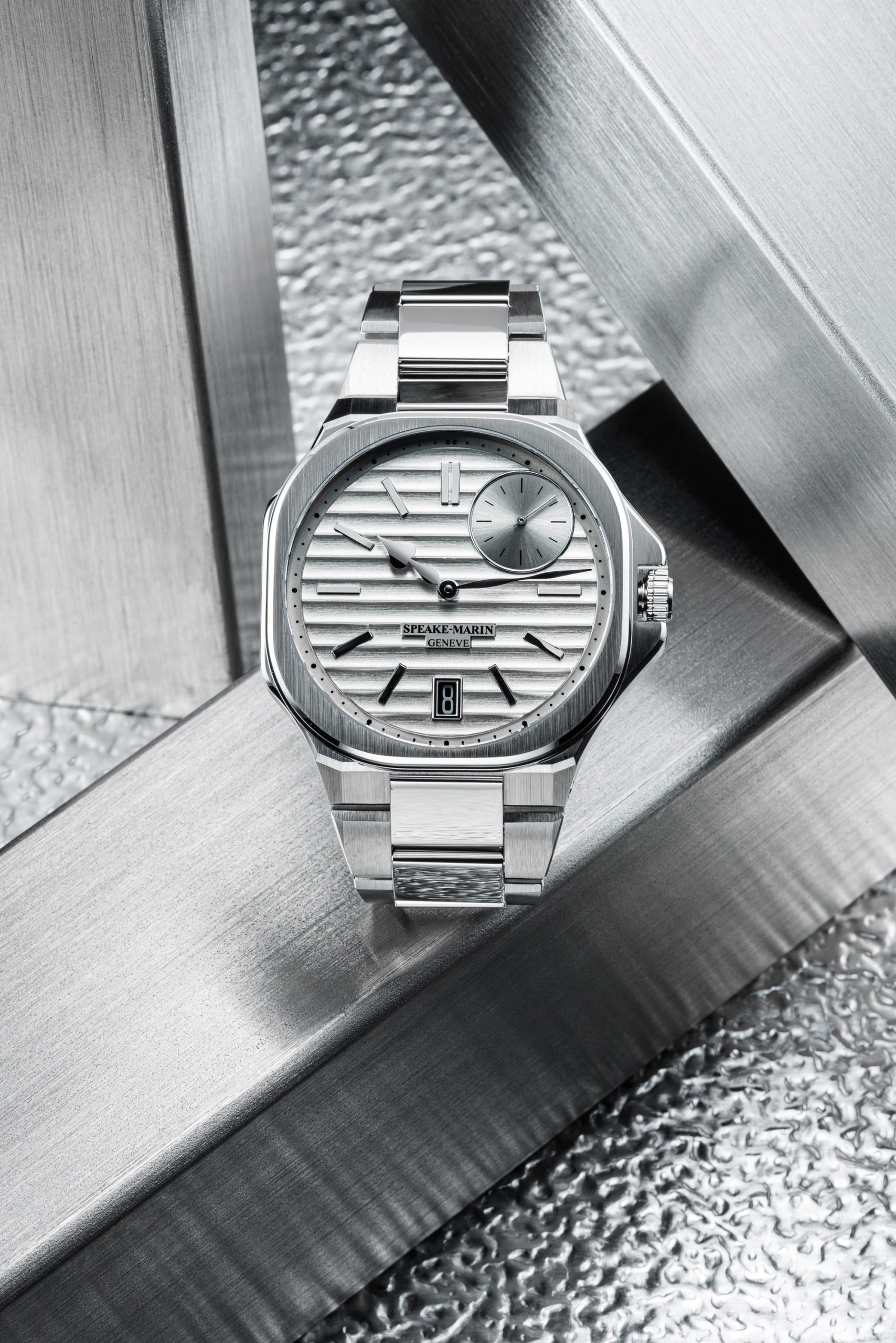 Introducing the Speake Marin Ripples Collection – a blend of contemporary style and timeless craftsmanship. This sport-chic watch is made entirely of stainless steel and pays homage to London’s iconic financial district with its unique “La City” case design. The latest addition to the Ripples collection is the Ripples Infinity Date, which was unveiled at Watches and Wonders 2024. This timepiece showcases sophistication and modernity with its metallic silver dial featuring twelve engraved horizontal ripples. It is equipped with the SMA03 TD movement designed and assembled by Speake Marin’s atelier, Le Cercle Des Horlogers. With its practical date display and sleek design, the Ripples Infinity Date is a versatile companion for any occasion,