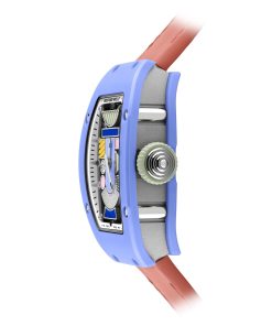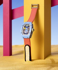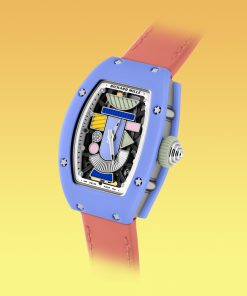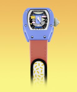 This collection from Richard Mille blends summer’s joyful vibe with the 1980s Memphis Design movement. It offers lightweight TZP ceramic cases, meticulous guillochage, and a choice of three soft pastel hues: blush pink, lavender, and powder blue. The RM 07-01 Coloured Ceramics by Richard Mille combines innovation and performance, marrying modernity with traditional craftsmanship. Guillochage, an art form of intricate lines, adds texture and plays with light and shadow. TZP ceramic’s durability and color retention ensure lasting beauty. The grey PVD-treated red gold dial showcases an engraved Memphis motif, complemented by colored ceramics, laser-cut rubber appliques, and diamond details. Choose from three different versions: blush pink, lavender, or powder blue TZP ceramics for enduring elegance.