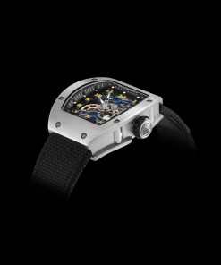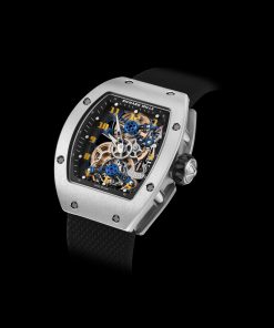 A true embodiment of Richard Mille’s identity, the RM 17-02 Tourbillon is powered by a manual-winding movement. Its lightweight yet robust structure houses the RM17-02 calibre, featuring a sapphire dial that reveals the watch’s intricate inner workings. The bridges, treated with blue PVD and 5N gold, shine against the grade 5 titanium baseplate, which is coated in black PVD to support the tourbillon movement, variable-inertia balance wheel, and fast-rotating barrel. These striking finishes are visible through the back of the watch, where silver and gold gears perform a mesmerizing kinetic dance. With a power reserve of around 70 hours, optimal transmission and distribution of power are guaranteed. The skeletonized design not only adds visual depth but also enhances the watch’s rigidity and precision, with indicators for power reserve and function further improving performance.