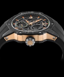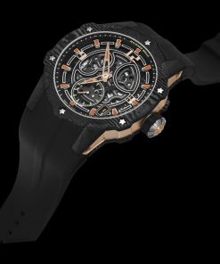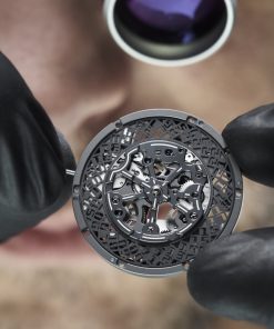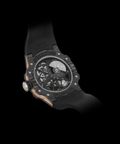 The RM 33-03 Automatic is Richard Mille’s rare foray into the round watch, but it’s anything but traditional. Offered in grade 5 titanium or Carbon TPT® with a 5N red gold caseband, it builds on the RM 33-02, fusing the sporty tonneau aesthetic with the purity of a circular case. Inside is the wafer-thin RMXP3 calibre, a skeletonised automatic movement just 3.28 mm thick. A platinum micro rotor mounted on ceramic bearings winds bi-directionally, while a titanium baseplate treated with Titalyt® and black PVD-coated bridges keep the ultra-thin construction rigid and precise.
