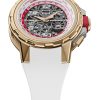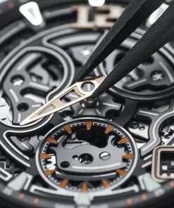 The dial feels almost architectural, with a semi-instantaneous date at 5 o’clock and a rare small seconds display at 6. A variable-inertia balance beats at 3Hz, regulated by four tiny weights to fine-tune its oscillation, driving a 40-hour power reserve. True to Richard Mille, finishing is exceptional, sandblasting, satin-finishing, and beveling create a play of light and shadow through the openworked structure. The 18K 5N red gold numerals appear to float on titanium rails, adding depth without distracting from the technicality beneath.