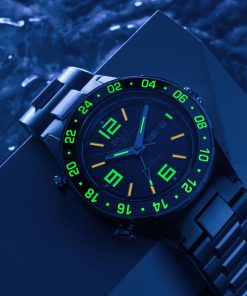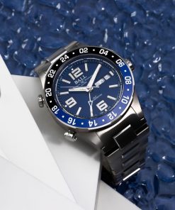 The Roadmaster Marine GMT is a watch designed by the BALL Watch Company, aimed at adventurers who need a reliable and technically advanced timepiece. The watch features a quick-set GMT function with push buttons that make adjusting time zones easier and faster. By using the button at 8 o’clock, the GMT hand can be moved backward, while the button at 10 o’clock moves it forward. This, combined with a bi-directional 24-hour bezel and main hands, allows for tracking three time zones simultaneously.