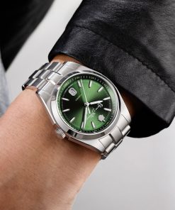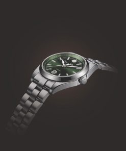 The Cuervo y Sobrinos Robusto 1935 features a stainless steel case, available in four dial colors (Habana, Ceniza, Azul Marino, and Verde Manzana), with luminescent hands and indices. The watch includes a date display at 6 o’clock, protected by a double-curved sapphire crystal. The stainless steel case measures 40mm in diameter and is water-resistant up to 100m, with a see-through case back showcasing the CYS 8130 automatic movement, enhanced with a blue openworked oscillating weight and Incabloc® shock absorber.