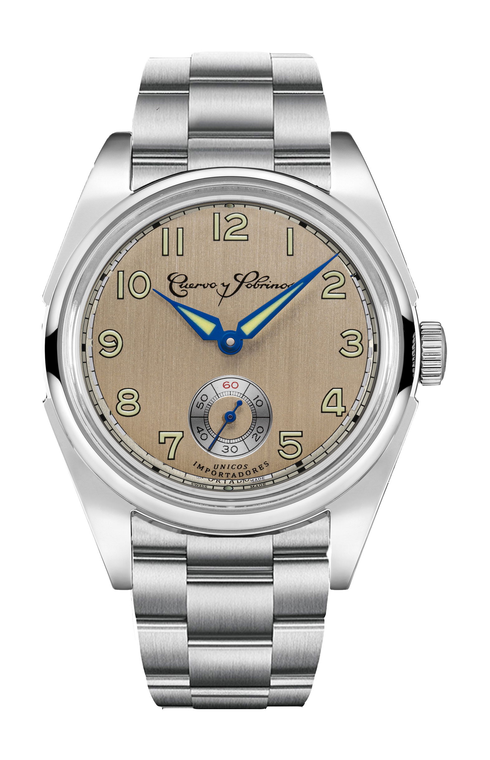 The Cuervo y Sobrinos Robusto Sans Souci is a vintage-themed watch inspired by the glamour of 1950s Cuba, particularly the famous Sans Souci cabaret near Havana. The timepiece reflects the hedonistic charm of the era, offering three dial finishes: sunray brushed black, vertical brushed champagne, and sunray brushed blue. The watch features generously proportioned hour and minute hands, bold Arabic-style indices, and Super-LumiNova® for enhanced visibility in dim light. The small seconds display is positioned at 6 o’clock.