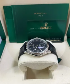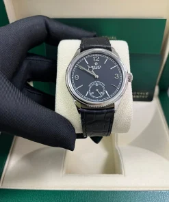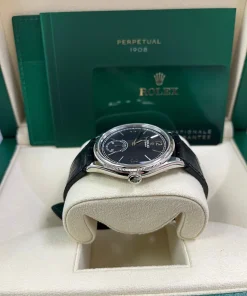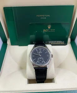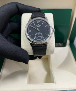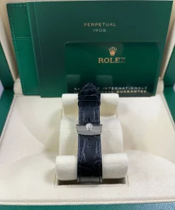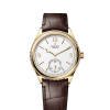 The Perpetual 1908 features a 39 mm case in 18 ct white gold with an alligator leather strap.