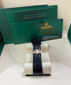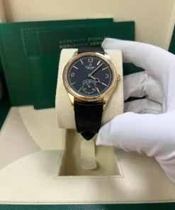 This 1908 version is fitted on an alligator leather strap. This elegant strap is distinctive for its green calfskin lining and tone-on-tone stitching.