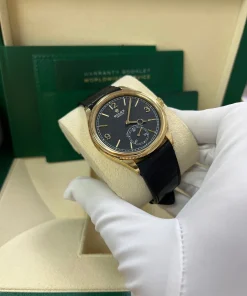 The Perpetual 1908 features a 39 mm case in 18 ct yellow gold with an alligator leather strap.