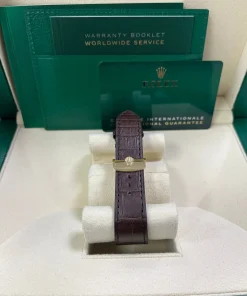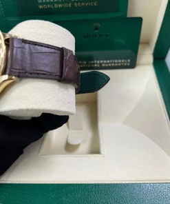 This 1908 version is fitted on an alligator leather strap. This elegant strap is distinctive for its green calfskin lining and tone-on-tone stitching.