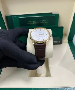 The Perpetual 1908 features a 39 mm case in 18 ct yellow gold with an alligator leather strap.