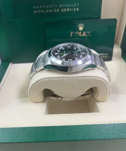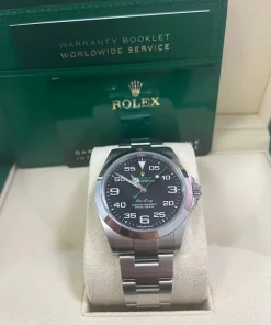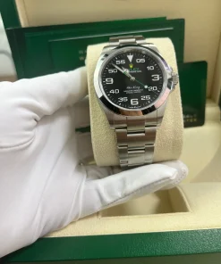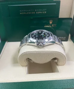 With its 40 mm case in Oystersteel, solid-link Oyster bracelet, and distinctive black dial, the Air-King perpetuates the aeronautical heritage of the original Rolex Oyster.