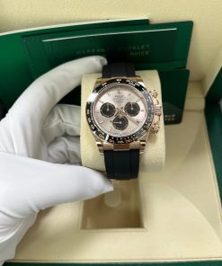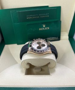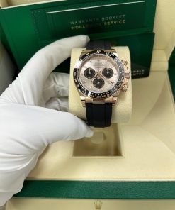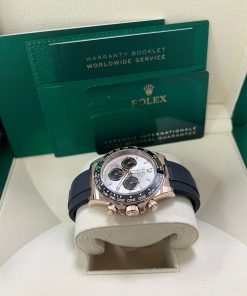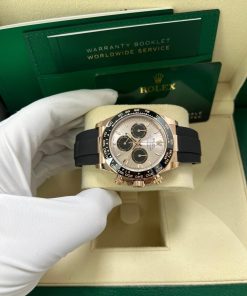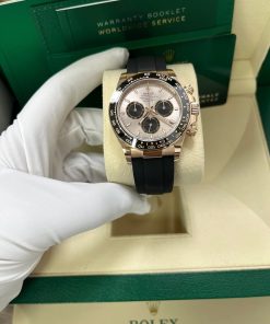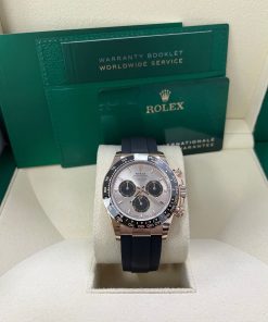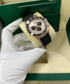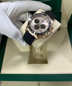 40mm 18K Everose gold case, screw-down back, screw-down crown with triplock triple waterproofness system, black monobloc cerachrom bezel in ceramic with moulded tachymetric scale, scratch-resistant sapphire crystal scratch-resistant sapphire, sundust and bright black dial, index hour markers, 4131, manufacture Rolex perpetual, mechanical chronograph, self-winding movement with centre hour and minute hands, small seconds hand at 6 o’clock, chronograph via centre seconds hand, 30-minute counter at 3 o’clock and 12-hour counter at 9 o’clock, stop seconds for exact time setting, approximately 72 hours of power reserve, Oysterflex strap made from flexible metal blades overmoulded with high-performance elastomer, folding Oysterlock safety buckle with rolex glidelock extension system. Waterproof to 100 metres / 330 feet.