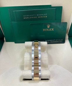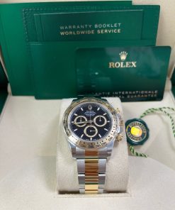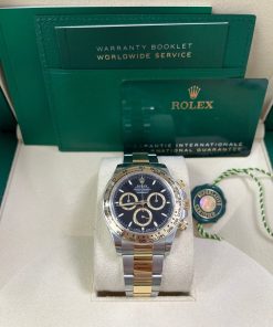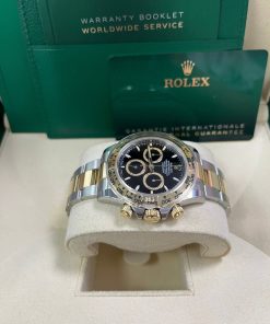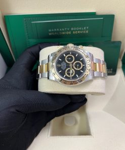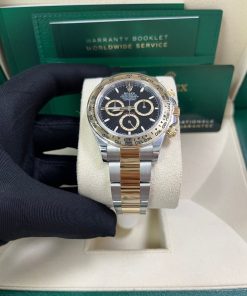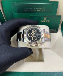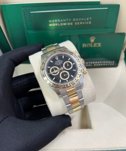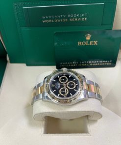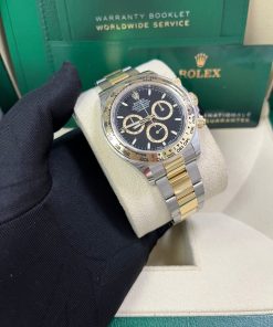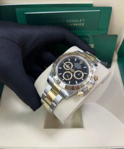 40mm yellow Rolesor case comprised of Oystersteel and yellow gold, screw-down back, screw-down crown with triplock triple waterproofness system, fixed bezel with engraved tachymetric scale in 18K yellow gold, scratch-resistant sapphire crystal scratch-resistant sapphire, black dial, index hour markers, 4131, manufacture Rolex perpetual, mechanical chronograph, self-winding movement with centre hour and minute hands, small seconds hand at 6 o’clock, chronograph via centre seconds hand, 30-minute counter at 3 o’clock and 12-hour counter at 9 o’clock, stop seconds for exact time setting, approximately 72 hours of power reserve, Oyster bracelet with three-piece solid links, folding Oysterlock safety buckle with Easylink 5mm comfort extension link. Waterproof to 100 metres / 330 feet.