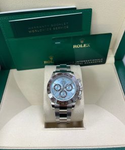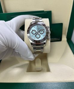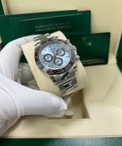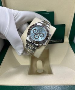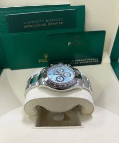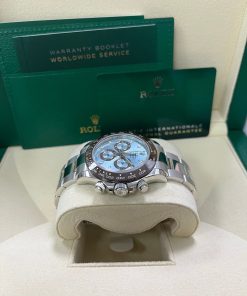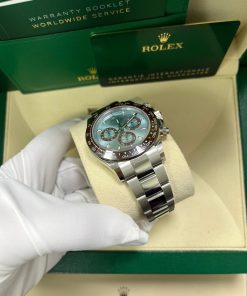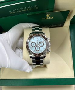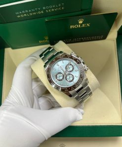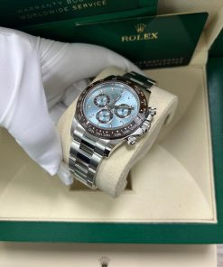 40mm 950 platinum case, chestnut brown monobloc Cerachrom bezel with engraved tachymetric scale deposited with platinum via PVD, screw-down crown and push buttons, ice blue dial with chestnut brown lacquer counters, Chromalight appliques on hands, index hour markers with Chromalight appliques, self-winding perpetual mechanical chronograph movement, folding Oysterlock bracelet with Easylink 5 mm comfort extension. Waterproof to 100 meters. 2020.