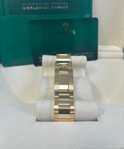 Paired with an 18K yellow gold Oyster bracelet with flat three-piece links, folding Oysterlock buckle, and Easylink 5mm comfort extension link. Water-resistant up to 100 meters for durability and reliability.