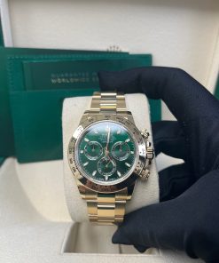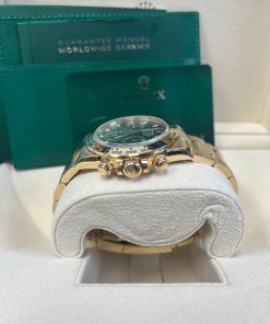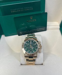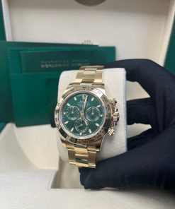 The striking green dial, famously associated with John Mayer, features index markers and a scratch-resistant sapphire crystal. Inside, the Rolex Caliber 4130 self-winding movement powers the chronograph central second, 30-minute counter (3 o’clock), and 12-hour counter (9 o’clock), offering 72-hour power reserve.