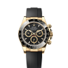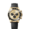 This Oyster Perpetual Cosmograph Daytona in 18 ct yellow gold, with an intense black and champagne-colour dial and an Oysterflex bracelet, features a black Cerachrom bezel with tachymetric scale.