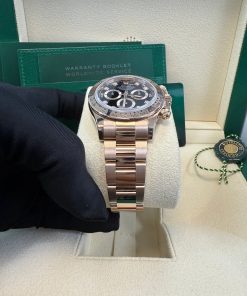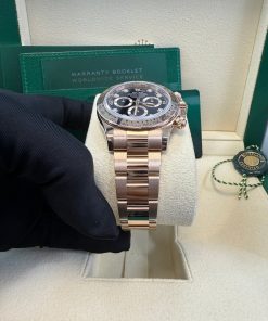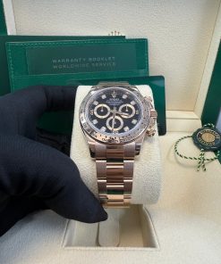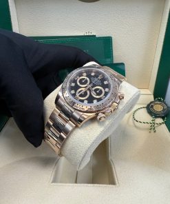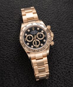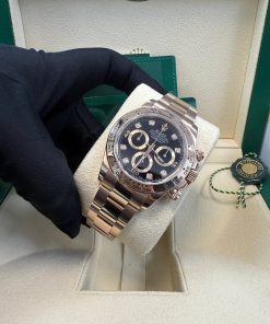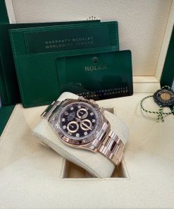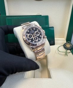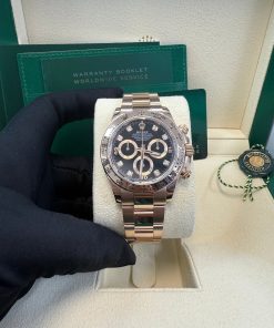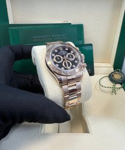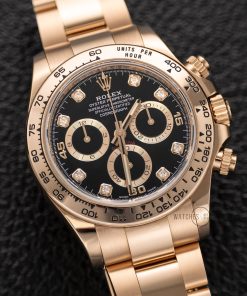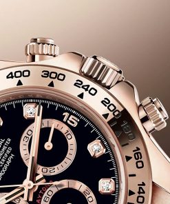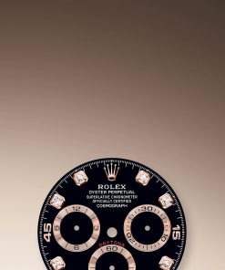 This Oyster Perpetual Cosmograph Daytona in 18 ct Everose gold, with a black, diamond-set dial and an Oyster bracelet, features an 18 ct Everose gold bezel with engraved tachymetric scale.