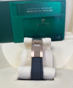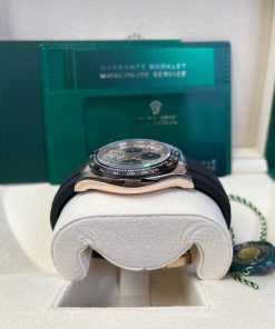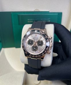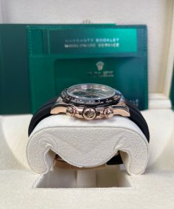 40mm 18K Everose gold case, screw-down Everose back, screw-down crown and push buttons with Triplock triple waterproofness, black monobloc Cerachrom bezel with engraved tachymetric scale, scratch-resistant double anti-reflective sapphire crystal, pink dial with black subdials, index hour markers, Rolex calibre 4130 perpetual self-winding movement with chronograph central second hand, 30-minute counter at 3 o’clock, and 12-hour counter at 9 o’clock, approximately 72 hours of power reserve, black Oysterflex strap made from flexible metal blades overmoulded with high-performance elastomer, Oysterlock folding safety buckle with Easylink 5mm rapid extension system. Waterproof to 100 meters.