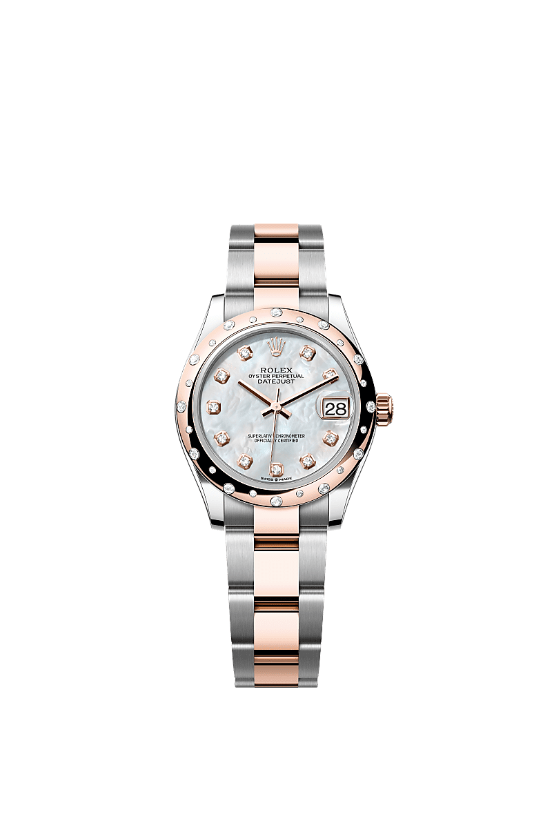 This Oyster Perpetual Datejust 31 in Oystersteel and Everose gold features a white mother-of-pearl, diamond-set dial and an Oyster bracelet.