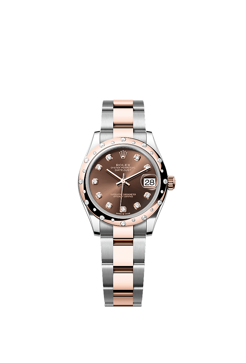 This Oyster Perpetual Datejust 31 in Oystersteel and Everose gold features a chocolate, diamond-set dial and an Oyster bracelet.