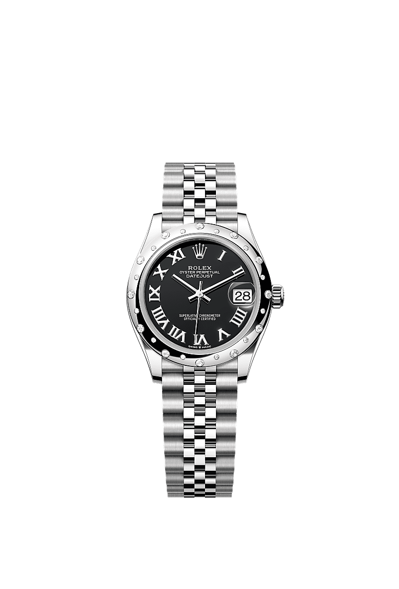This Oyster Perpetual Datejust 31 in Oystersteel and white gold features a bright black dial and a Jubilee bracelet.