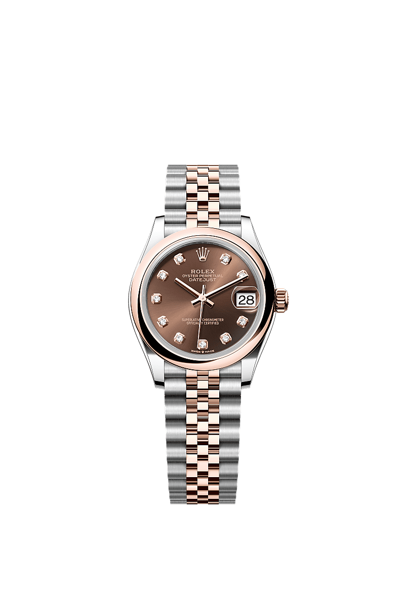 This Oyster Perpetual Datejust 31 in Oystersteel and Everose gold features a chocolate, diamond-set dial and a Jubilee bracelet.