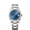 This dial features diamonds in 18 ct gold settings. The sunray finish creates delicate light reflections on many dials in the Oyster Perpetual collection. It is obtained using masterful brushing techniques that create grooves running outwards from the centre of the dial.