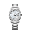 This dial features a large VI set with 11 diamonds. The sunray finish creates delicate light reflections on many dials in the Oyster Perpetual collection. It is obtained using masterful brushing techniques that create grooves running outwards from the centre of the dial.