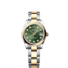 This Oyster Perpetual Datejust 31 in Oystersteel and yellow gold features an olive-green, diamond-set dial and an Oyster bracelet.