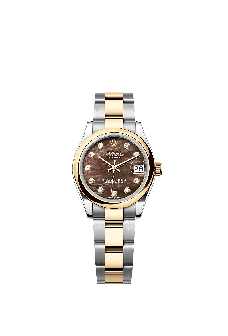 This Oyster Perpetual Datejust 31 in Oystersteel and yellow gold features a black mother-of-pearl, diamond-set dial and an Oyster bracelet.