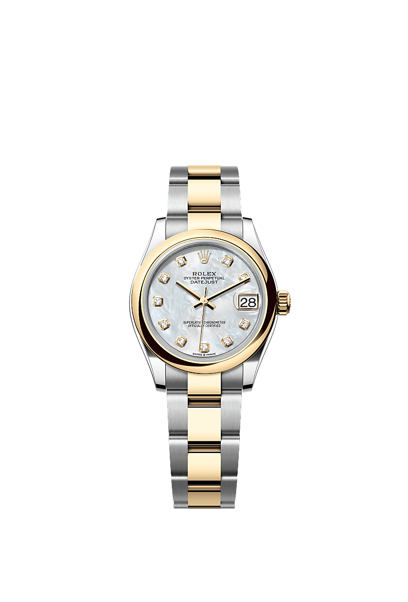 This Oyster Perpetual Datejust 31 in Oystersteel and yellow gold features a white mother-of-pearl, diamond-set dial and an Oyster bracelet.