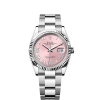 This dial features diamonds in 18 ct gold settings. The sunray finish creates delicate light reflections on many dials in the Oyster Perpetual collection. It is obtained using masterful brushing techniques that create grooves running outwards from the centre of the dial.
