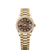 This Oyster Perpetual Datejust 31 in 18 ct yellow gold features an olive-green, diamond-set dial and a President bracelet.