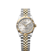 This Oyster Perpetual Datejust 31 in 18 ct yellow gold features a silver, diamond-set dial and a President bracelet.