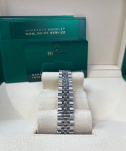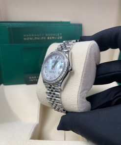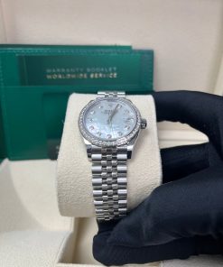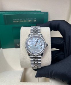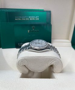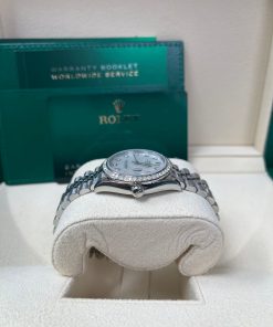 31mm white Rolesor case comprised of Oystersteel and 18K white gold, screw-down back, screw-down crown with twinlock double waterproofness system, 18K white gold bezel set with 46 diamonds, scratch-resistant sapphire crystal with cyclops lens over the date, white mother-of-pearl dial, diamond hour markers, Rolex calibre 2236 perpetual self-winding movement with date at 3 o’clock, approximately 55 hours of power reserve, Oystersteel Jubilee bracelet with five-piece links, concealed folding Crownclasp buckle. Waterproof to 100 meters.