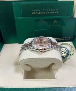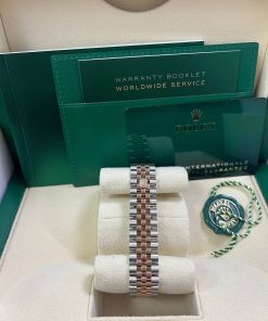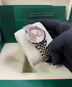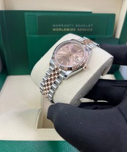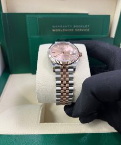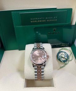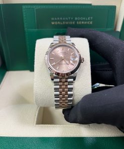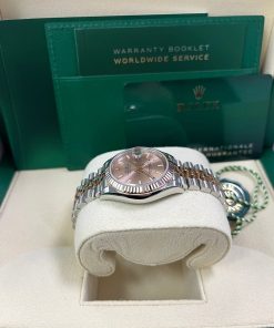31mm Everose Rolesor case comprised of Oystersteel and 18K Everose gold, screw-down back, screw-down crown with twinlock double waterproofness system, 18K Everose gold fluted bezel, scratch-resistant sapphire crystal with cyclops lens over the date, rosé dial, index hour markers, Rolex calibre 2236 perpetual self-winding movement with date at 3 o’clock, approximately 55 hours of power reserve, Everose Rolesor Jubilee bracelet with semi-circular three-piece links, concealed folding Crownclasp buckle. Waterproof to 100 meters.