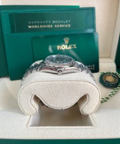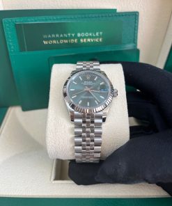 31mm white Rolesor case comprised of Oystersteel and 18K white gold, screw-down back, screw-down crown with twinlock double waterproofness system, 18K white gold fluted bezel, scratch-resistant sapphire crystal with cyclops lens over the date, mint green dial, index hour markers, Rolex calibre 2236 perpetual self-winding movement with date at 3 o’clock, approximately 55 hours of power reserve, Oystersteel Jubilee bracelet with five-piece links, concealed folding Crownclasp buckle. Waterproof to 100 meters