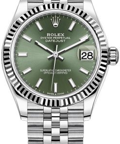 31mm white Rolesor case comprised of Oystersteel and 18K white gold, screw-down back, screw-down crown with twinlock double waterproofness system, 18K white gold fluted bezel, scratch-resistant sapphire crystal with cyclops lens over the date, mint green dial, index hour markers, Rolex calibre 2236 perpetual self-winding movement with date at 3 o’clock, approximately 55 hours of power reserve, Oystersteel Jubilee bracelet with five-piece links, concealed folding Crownclasp buckle. Waterproof to 100 meters