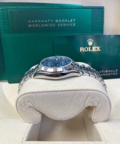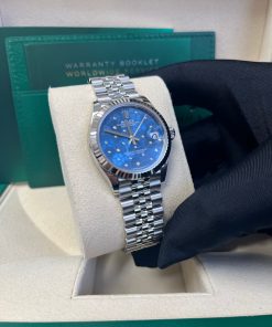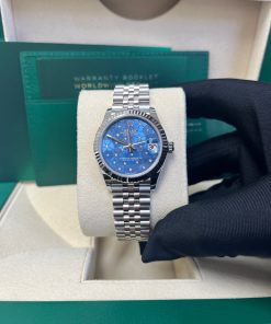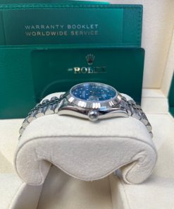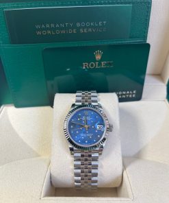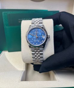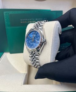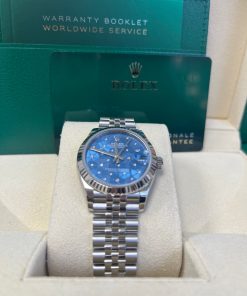 31mm white Rolesor case comprised of Oystersteel and white gold, screw-down back, screw-down crown with twinlock double waterproofness system, fluted bezel, scratch-resistant sapphire crystal with cyclops lens over the date, azzurro blue floral motif dial set with 24 diamonds, Rolex calibre 2236 perpetual self-winding movement with centre hour, minute and seconds hands, instantaneous date with rapid setting, and stop-seconds for precise time setting, approximately 55 hours of power reserve,