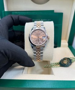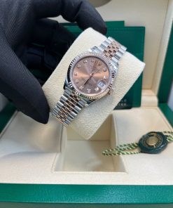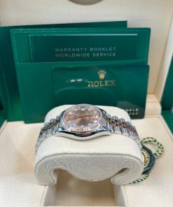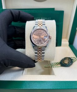 31mm Everose Rolesor case comprised of Oystersteel and 18K Everose gold, screw-down back, screw-down crown with twinlock double waterproofness system, 18K Everose gold fluted bezel, scratch-resistant sapphire crystal with cyclops lens over the date, rosé dial, diamond hour markers, Rolex calibre 2236 perpetual self-winding movement with date at 3 o’clock, approximately 55 hours of power reserve, Everose Rolesor Jubilee bracelet with semi-circular three-piece links, concealed folding Crownclasp buckle. Waterproof to 100 meters.
