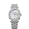 This Oyster Perpetual Datejust 36 in Oystersteel features a silver dial and an Oyster bracelet.