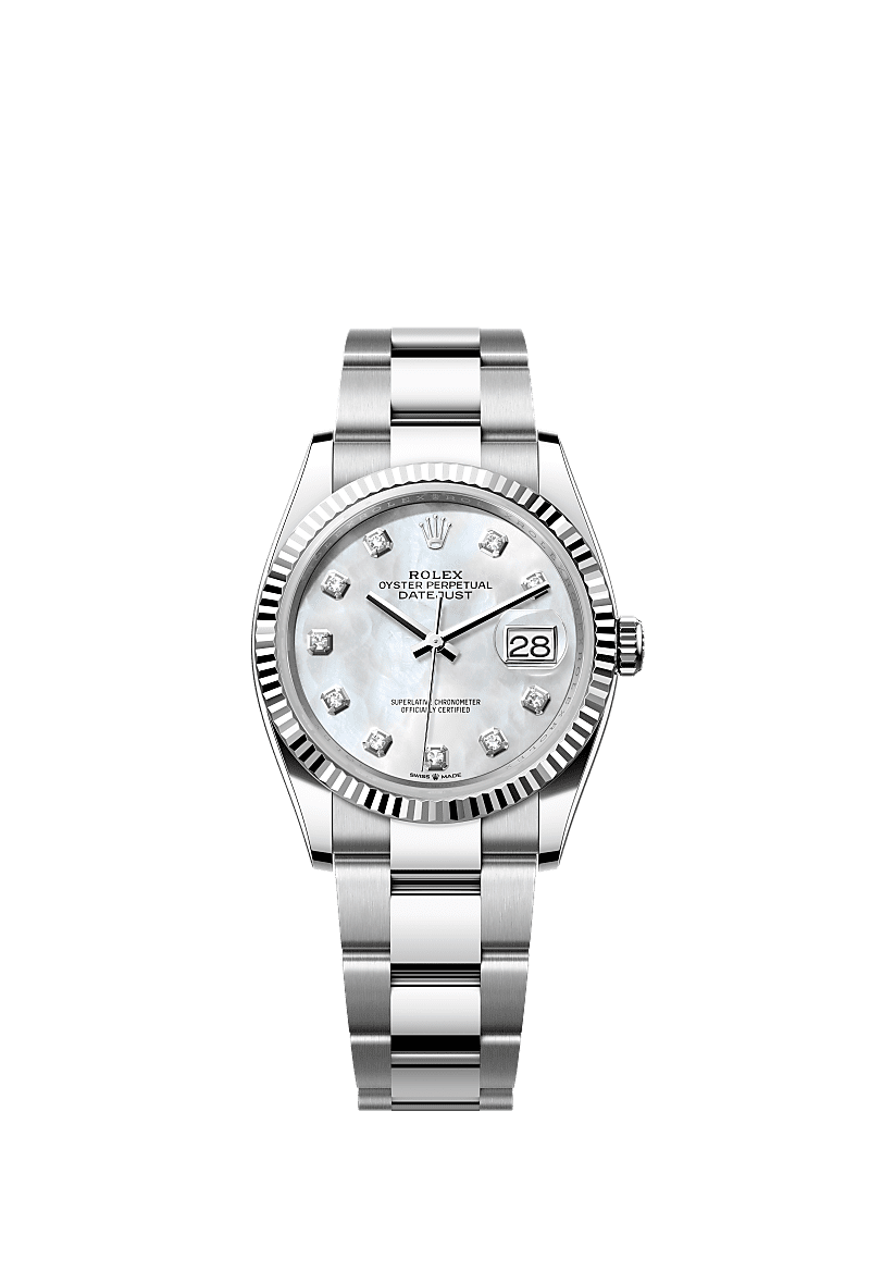 This Oyster Perpetual Datejust 36 in Oystersteel and white gold features a white mother-of-pearl, diamond-set dial and an Oyster bracelet.