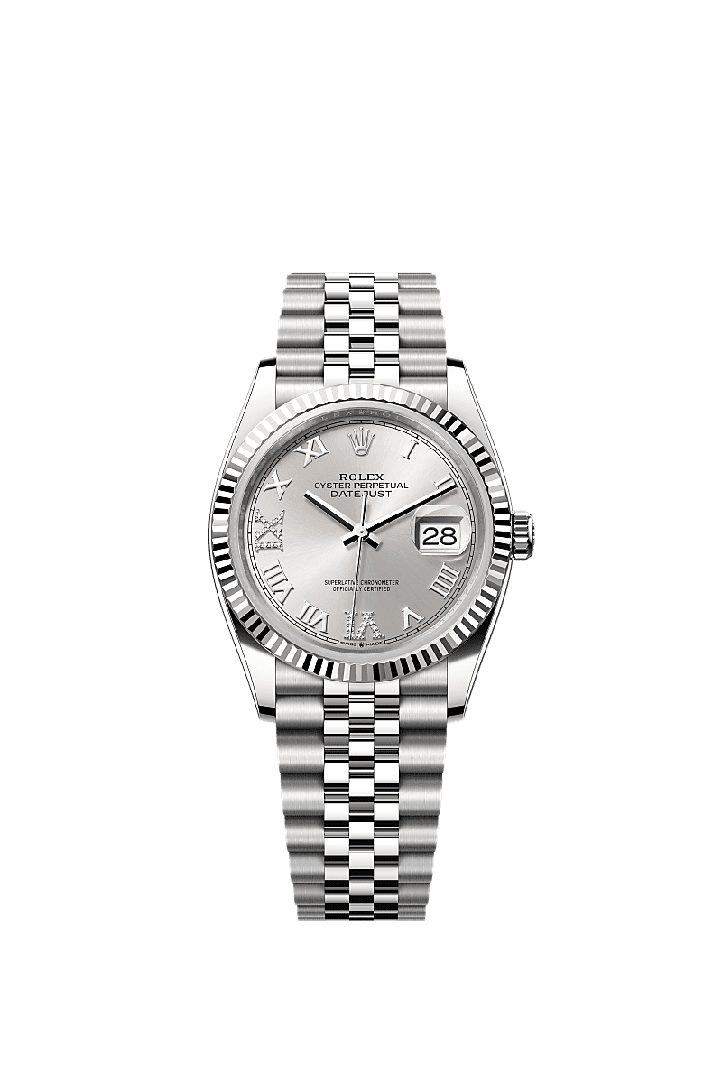 This Oyster Perpetual Datejust 36 in Oystersteel and white gold features a silver, diamond-set dial and a Jubilee bracelet.